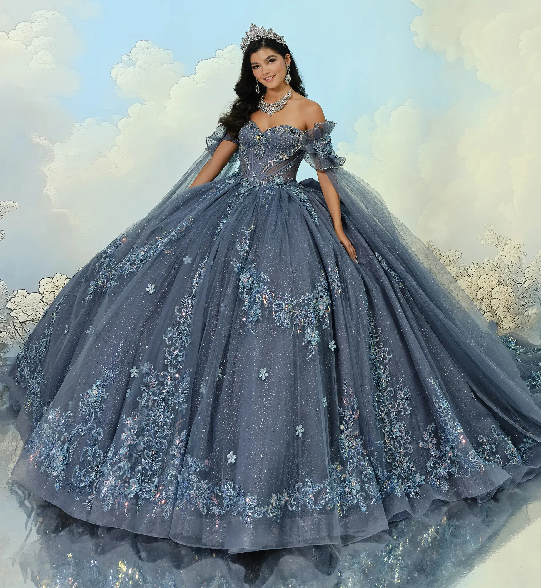 Fabric:Glitter Tulle, Lace applique, Stone Accents, Three-dimensional flowers, Tulle